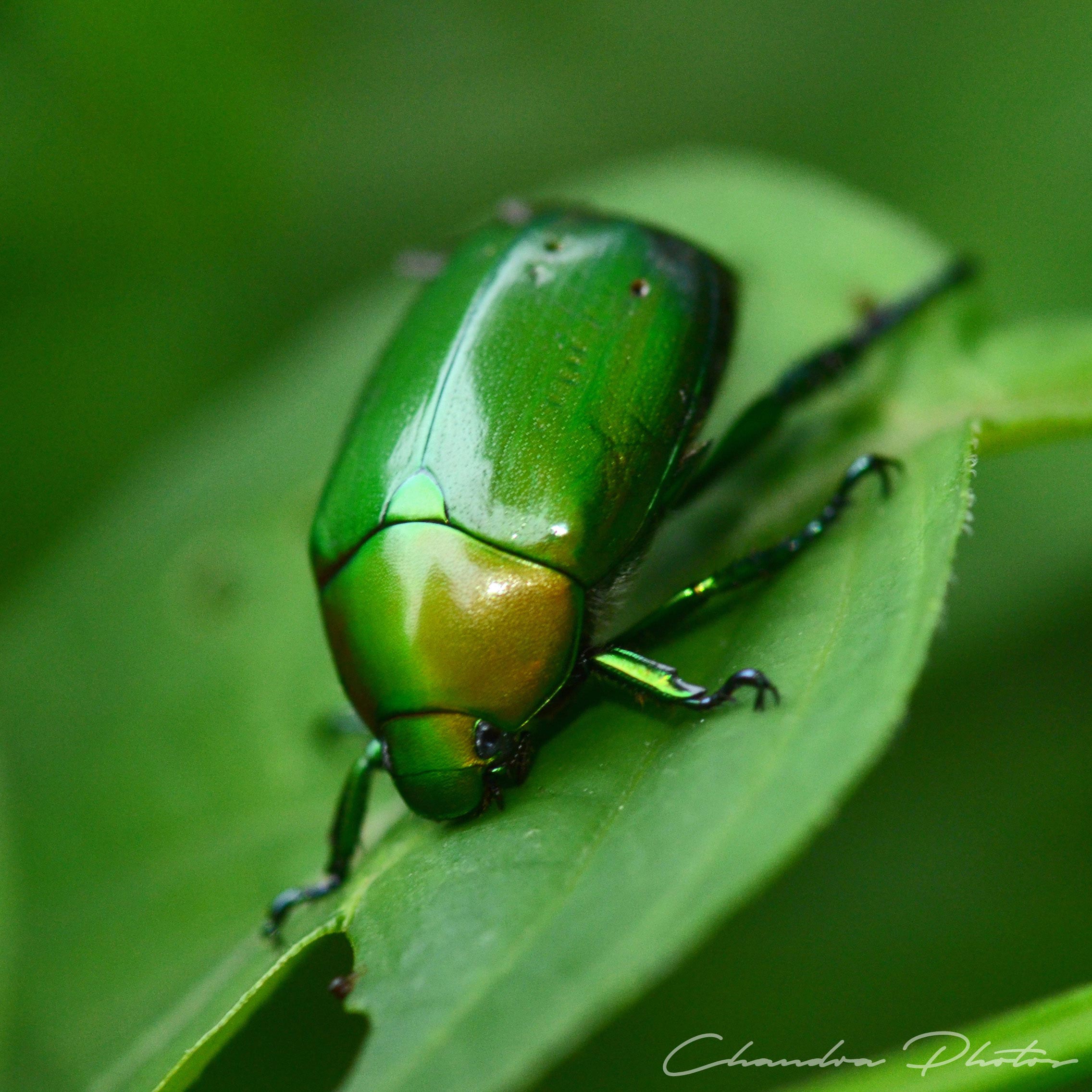 The green June beetle is active during daylight hours. The adult is usually 15–22 mm (0.59–0.87 in) long with dull, metallic green wings; its sides are gold and the head, legs and underside are very bright shiny green. Their habitat extends from Maine to Georgia, and as far west as Kansas, with possible population crossover in Texas with their western cousin, the figeater beetle.