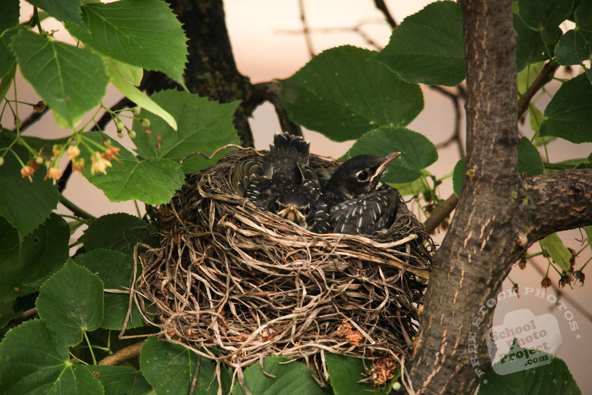 Free Photo Tags: robin bird, robin bird chicks, young American robins, baby robins, robin's nest, bird nest, tree, green leaves, free animal stock photo, royalty-free image, school photo project use