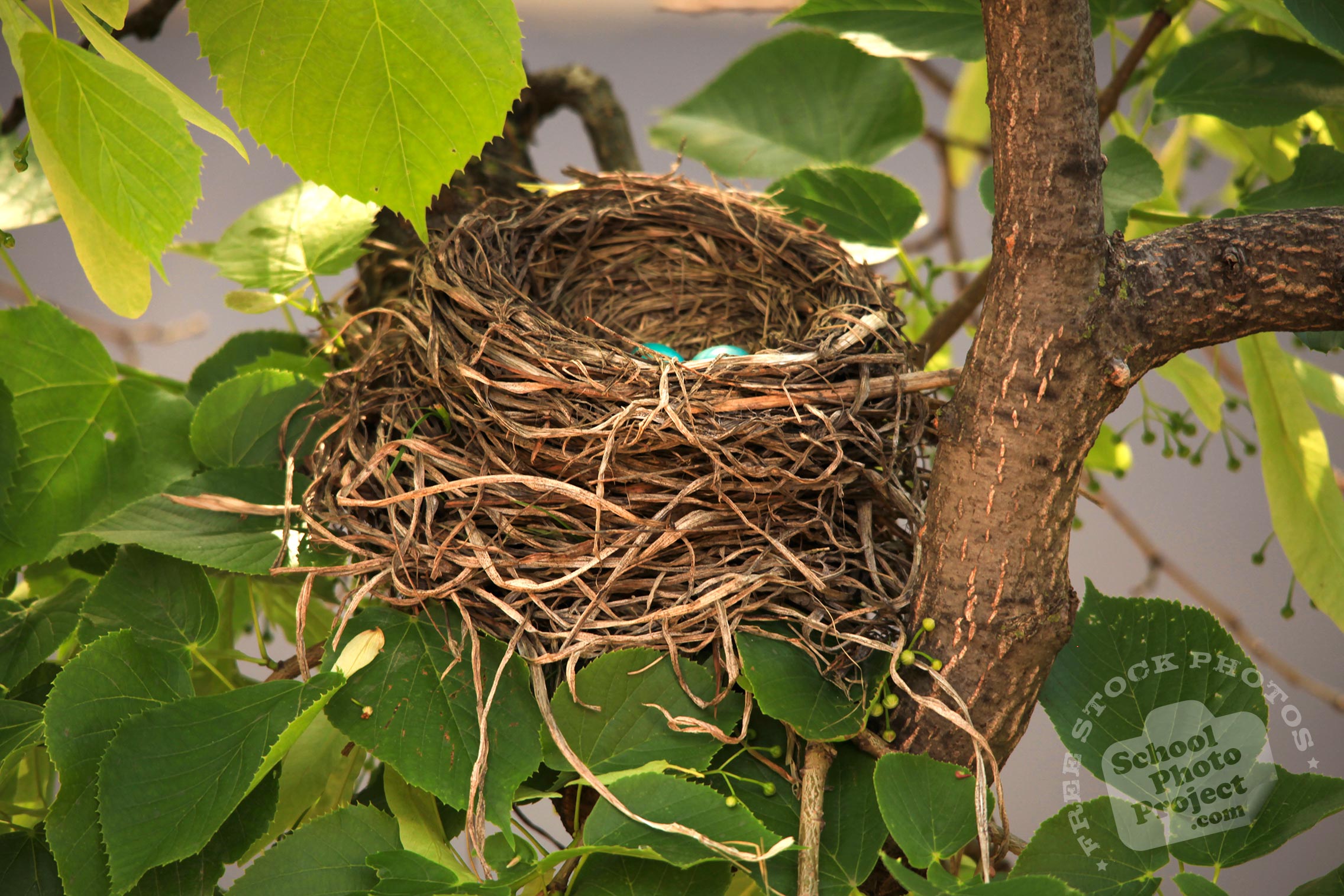 Free Photo Tags: robin bird, American robin, robin's nest, robin's blue eggs, bird nest, tree, green leaves, free animal stock photo, royalty-free image, school photo project use